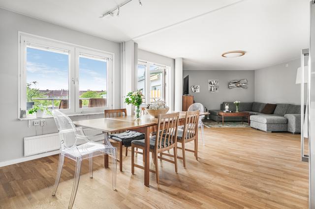 Välplanerad 4:a med underbar balkong i bästa solläge. Mycket trevlig social öppen planlösning.