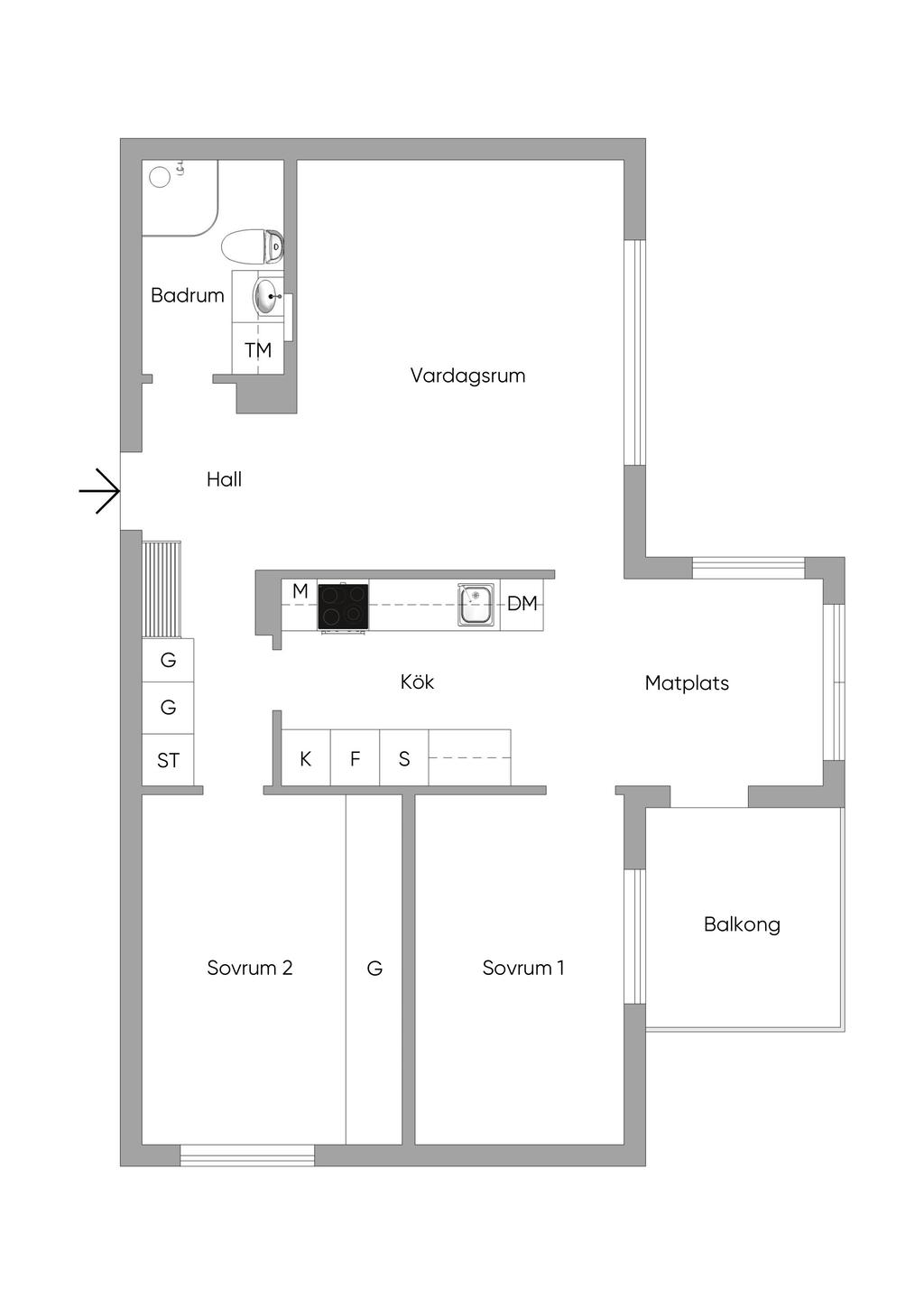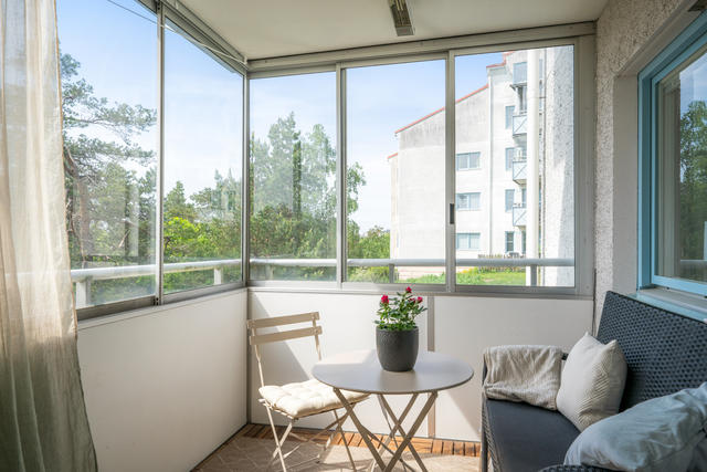 Mycket ljus och stilsäker hörntrea utan insyn. Balkong med sol under större delen av dagen!