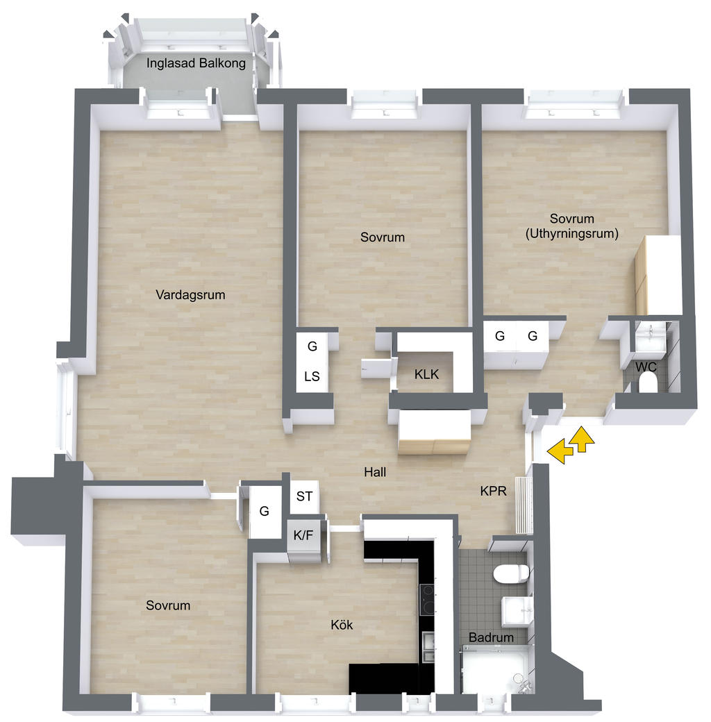 Stor och ljus gavellägenhet med inglasad balkong och möjlighet till uthyrningsdel med egen ingång!