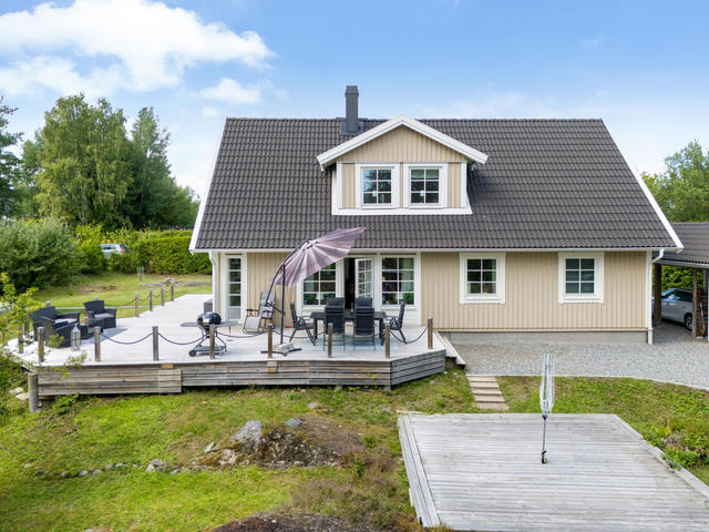 Fristående villa med låga energikostnader omgivet av grönska
