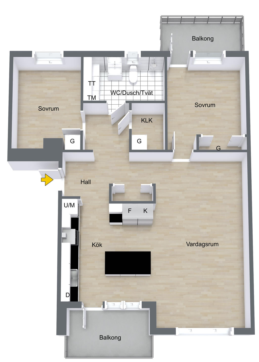 Trevlig genomgångslägenhet högt upp i fastigheten med två balkonger och hiss från markplan!