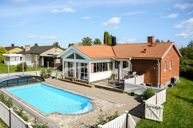 Charmig Familjevilla med Pool och Inglasat Uterum – En Perfekt Oas för Familjeliv