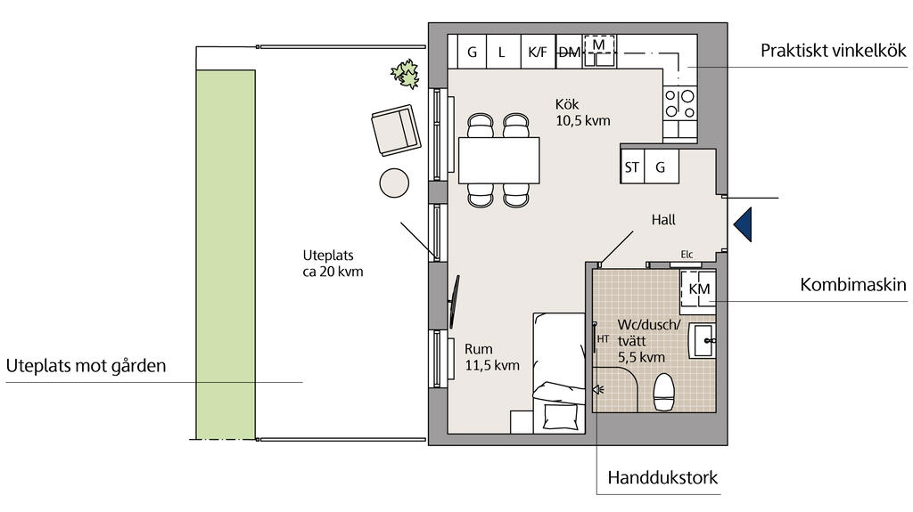 Välkommen in till en välplanerad etta där du kan njuta av kvällssolen på en trevlig uteplats i väst