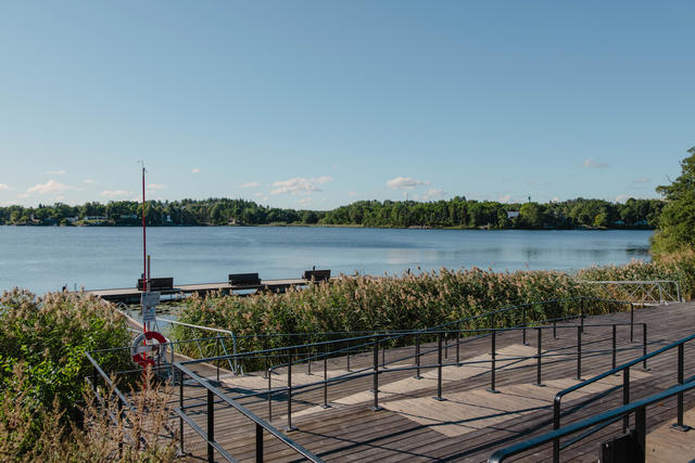 Gaveltrea med inglasad balkong nära sjön Drevviken