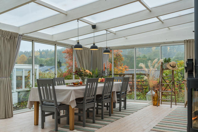 Familjevänligt enplanshus med inglasat uterum och trädgårdsoas på Smaragdvägen!