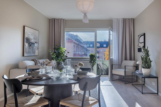 Elegant trea med generöst ljusinsläpp, dekorativ eldstad och balkong i fritt söderläge. Jur.pers OK.