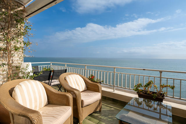 Charmig bostad med havsutsikt och balkong på strandpromenaden