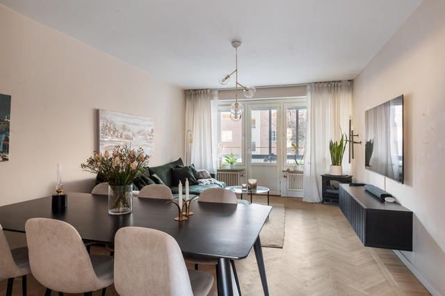 Elegant och rymlig lägenhet. Njut av fiskbensparkett, nytt kök och stor inglasad balkong