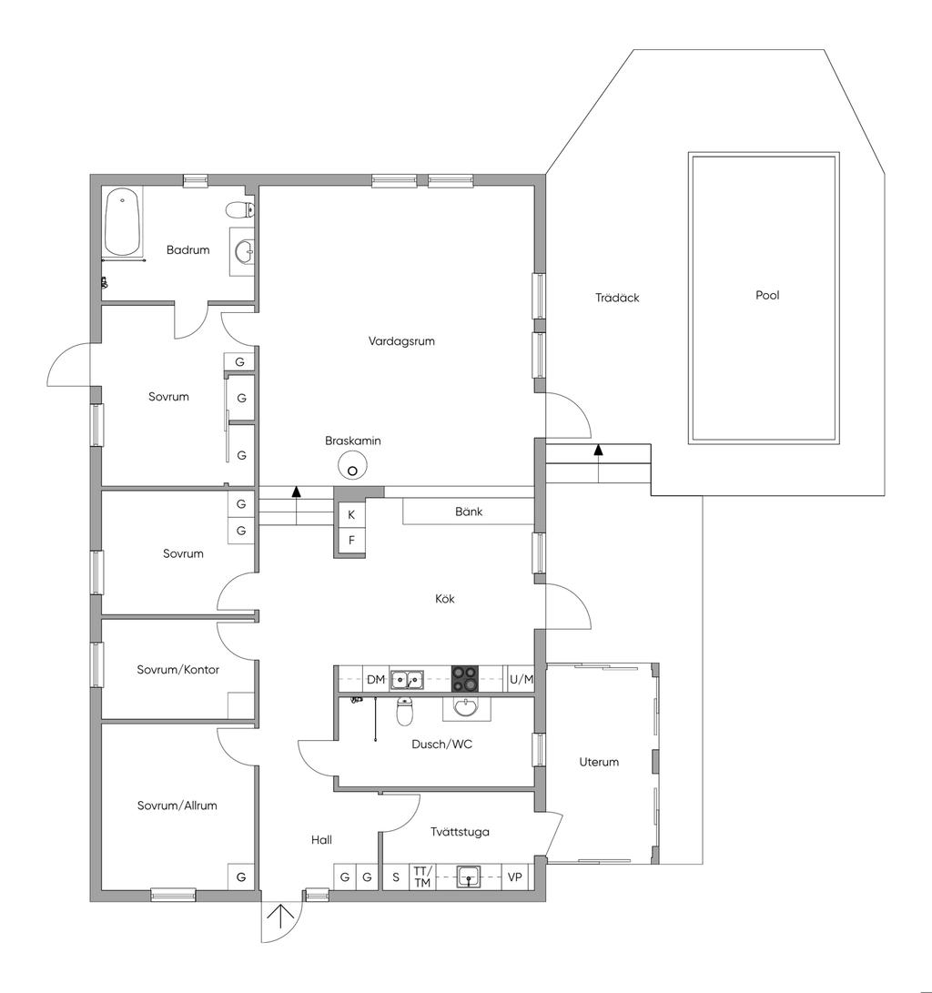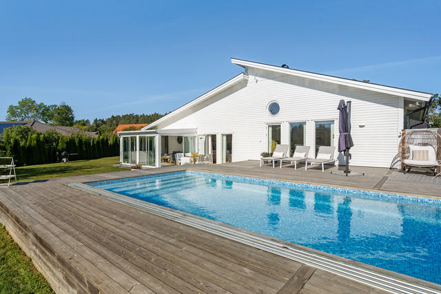 Tilltalande enplanshus med uterum och soldränkt trädäck med pool