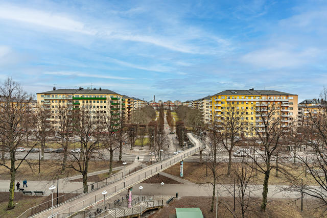 Högt upp i huset med stor balkong och fri utsikt över Tessinparkens grönska!