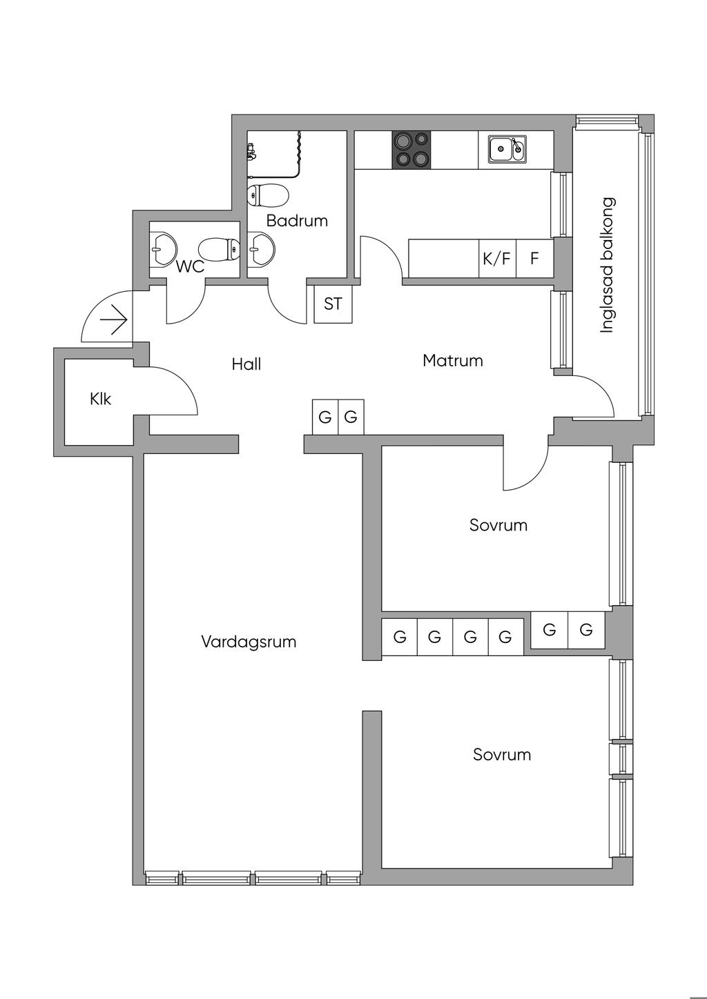 Välplanerad 3.a med inglasad balkong högst upp i huset
