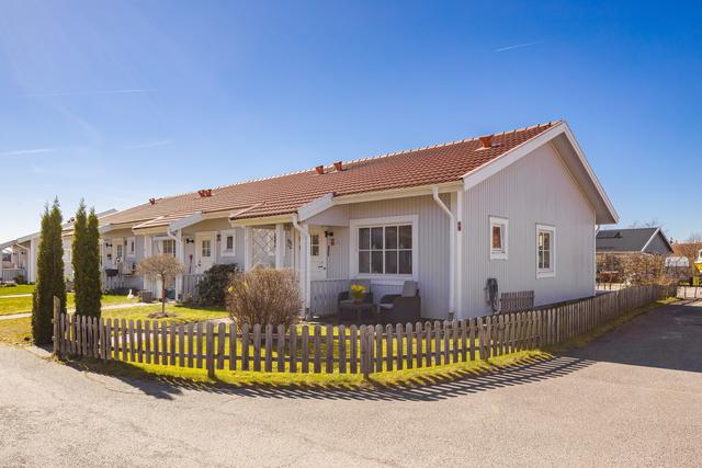 Välkommen till Trädgårdsvägen 22 – en charmig tvårummare i radhusform på ett plan i Grästorp!