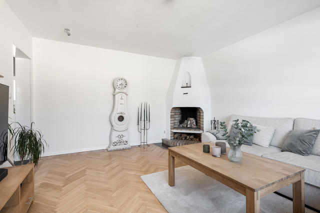Ljus och hemtrevlig 3:a högst upp i huset med eldstad och balkong!
