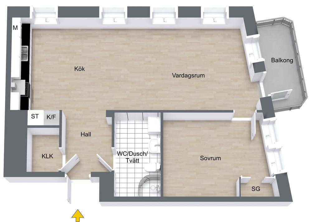 Väl tilltagen gavellägenhet om 2 rok med öppen planlösning och stor balkong i högt läge!