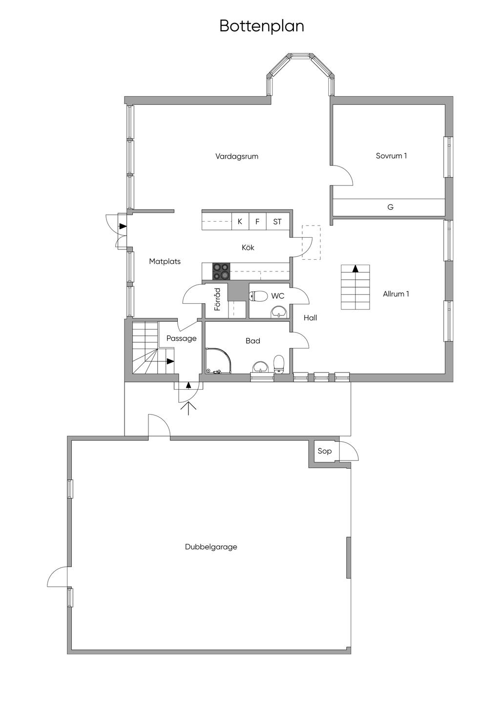 1,5-plan med källare och dubbelgarage på hörntomt med utsikt över grönområde