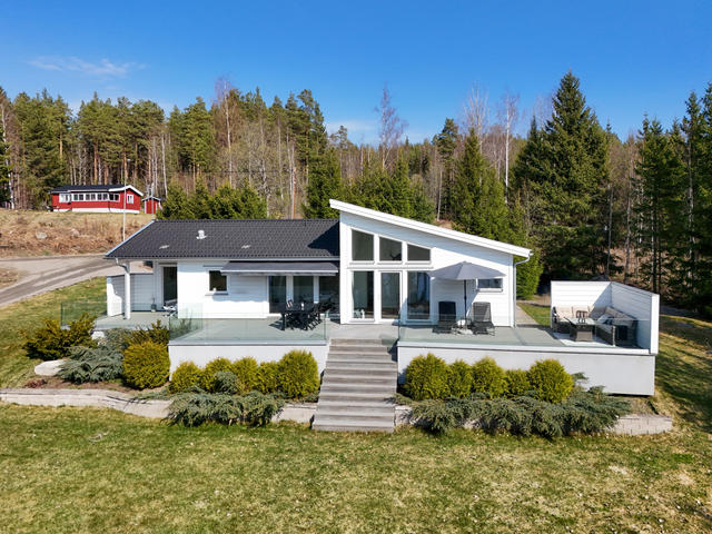 Modernt fritidshus med sjöutsikt och tillgång till brygga, bad- och båtplats