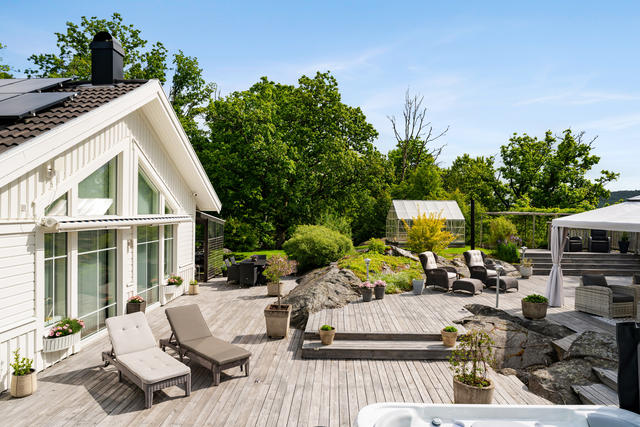 Smakfull enplansvilla med bl.a. solceller, dubbelgarage, spabad, växthus!