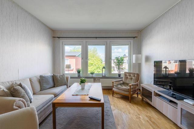 Välplanerad bostad med renoverat badrum mot områdets grönskande äppellund!