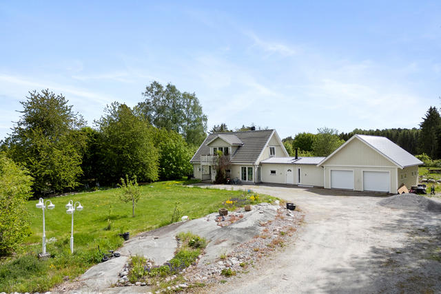 1½-plansvilla med pool, dubbelgarage och stor trädgårdstomt i söderläge.