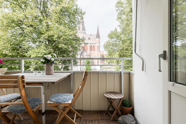 Trerummare med balkong och utsikt över Sofiakyrkan – BRF Herden, Väster!