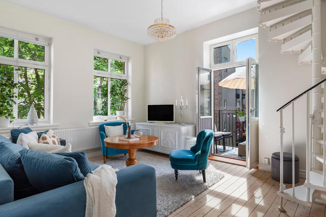 Unik etagelägenhet på gavelläge med spiraltrappa, söderbalkong och sekelskiftescharm!