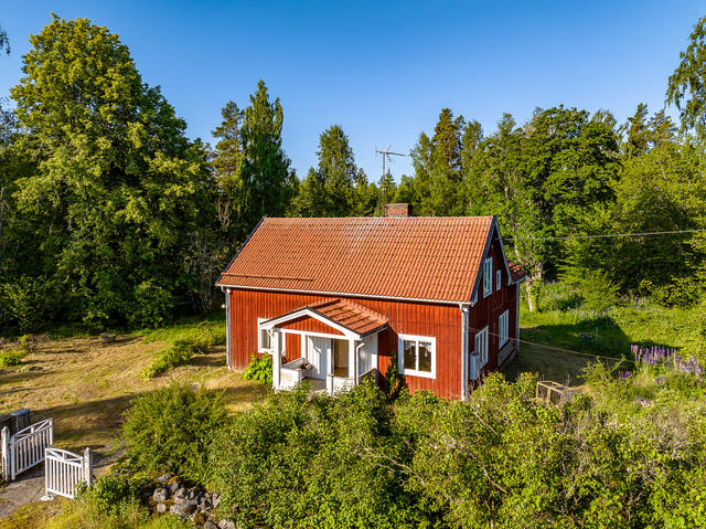 Röd stuga med vita knutar längs grusvägar i skogen - nära till badplats i Alsterån!