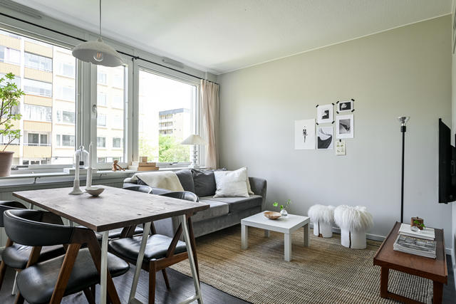 Unik lägenhet om 45 kvadratmeter med vardagsrum, kök, 2 sovalkover och balkong