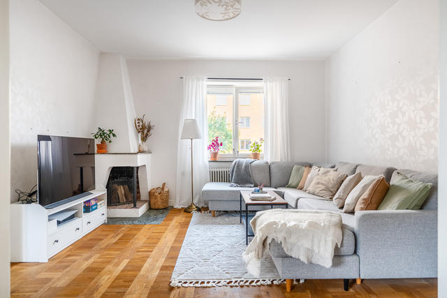 Ljus och charmig trea med öppen spis, stor balkong i bästa solläge – och oslagbart pendlarläge!