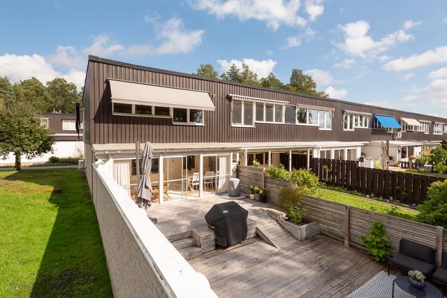 Gavelradhus med inglasad altan och stort trädäck i populära Talltorp