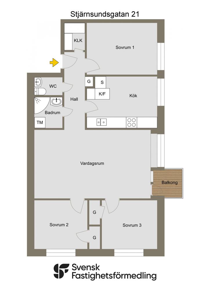 Barnvänlig och yteffektiv fyrarumslägenhet med naturnära, ostört och barnvänligt gavelläge