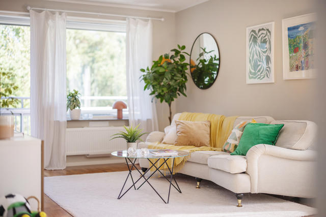 Rymlig bostad med ordentlig balkong mot skogsparti.