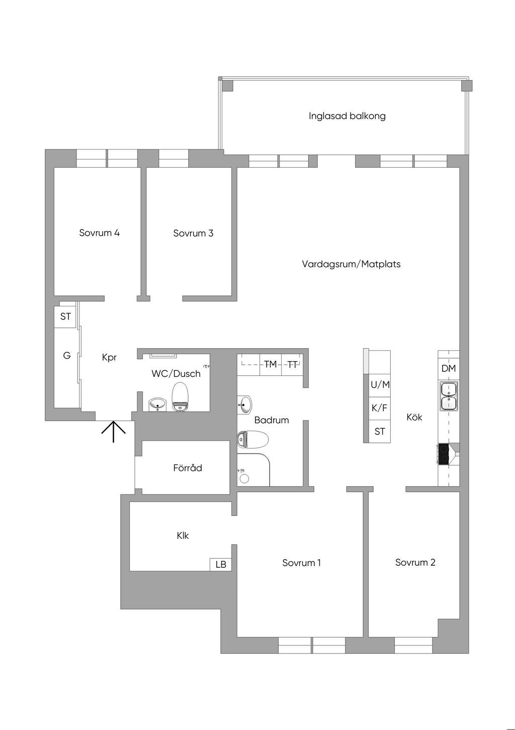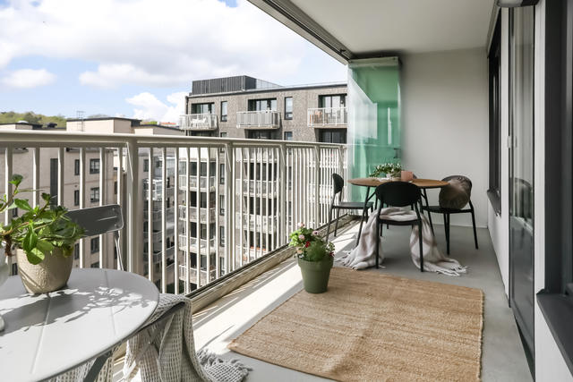 Ovanligt välplanerad femma belägen näst högt upp i huset med inglasad solig balkong och två badrum.