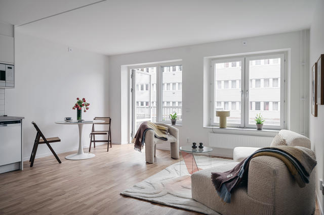Fin tvåa med smakfulla materialval och stor härlig balkong i söderläge.
