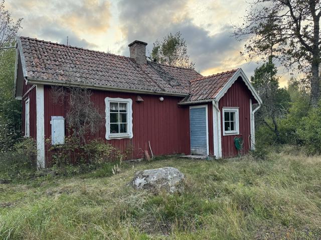 Röd stuga med vita knutar och lantlig charm i Kalsvik