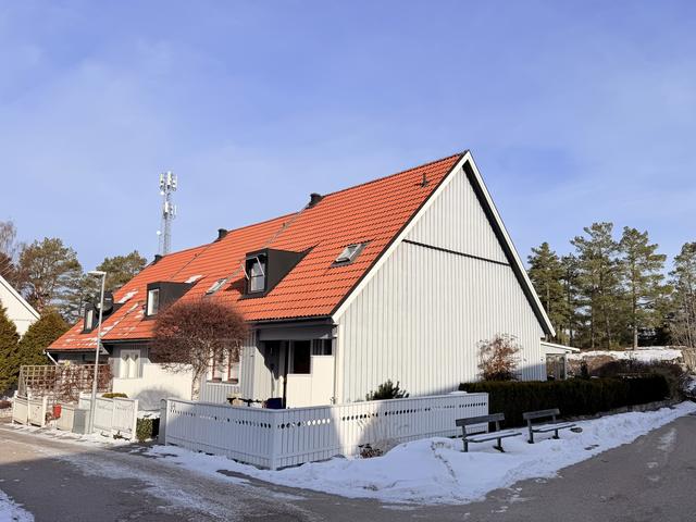 Välplanerat hörnradhus med inglasat uterum på populära Arnö