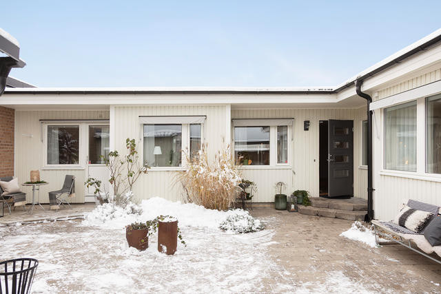 Stilrent renoverat enplan med unik planlösning och atriumlik uteplats