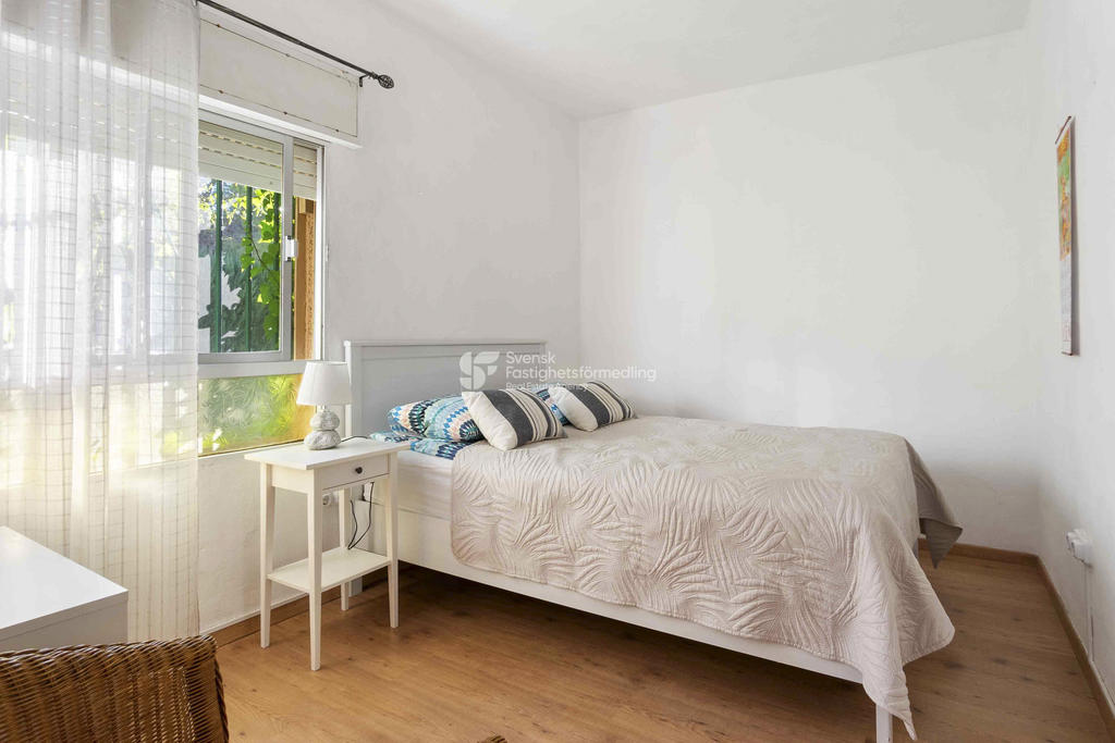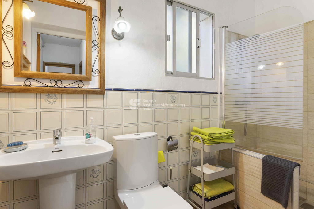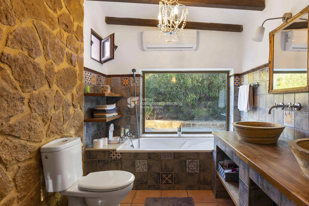 Huvudentrén ligger intill den upphöjda terrassen med utsikt över poolen. Här kommer du in i det rymliga vardagsrummet med trappen ner till det inredda källarplanet. Här finns både AC och öppen spis. Vidare fram ligger det fullt utrustade köket med utgång till ännu en terrass och ett förråd. Samtliga 3 sovrum ligger även på detta plan. Master bedroom har ett vackert ensuit badrum med badkar och stort fönster. Här kan du ligga och titta ut över bergstopparna! Från trappan i vardagsrummet kommer du ner till den rymliga källaren med utgång till fruktträdgården.