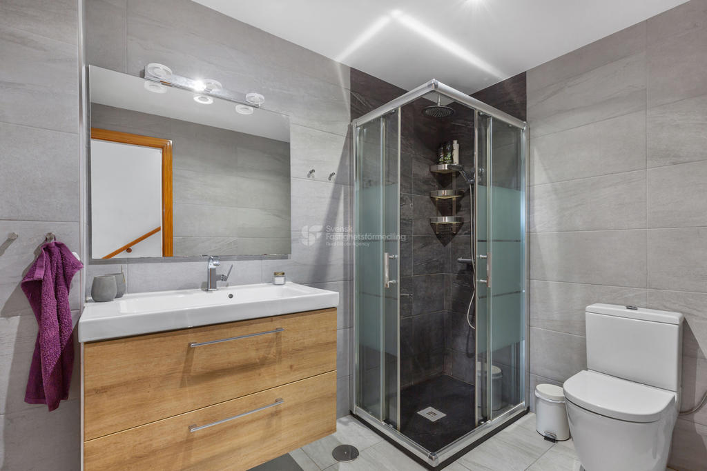Du välkomnas direkt in i ett ljust och inbjudande vardagsrum med öppet kök i anslutning, vilket skapar en social och hemtrevlig känsla. På bottenvåningen finns även ett sovrum, ett badrum samt praktisk förvaring – idealiskt för gäster eller för dig som vill ha allt bekvämt på ett plan.