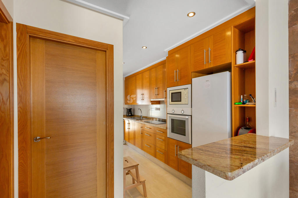 Kök och vardagsrum har en öppen och social planlösning som skapar ljusa och trivsamma ytor med gott om plats för både umgänge och avkoppling. Från vardagsrummet nås terrassen vid entrén, varifrån man har en trevlig utsikt över ett av det gemensamma poolområdena. Via köket når man den andra uteplatsen i markplan.