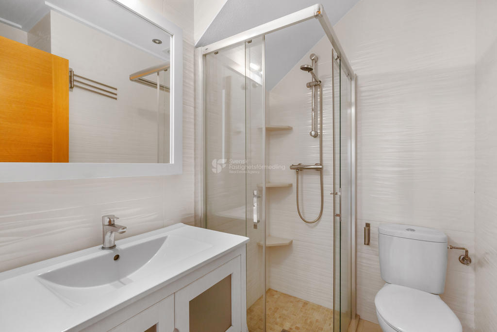 Ett av sovrummen är beläget på entréplanet, vilket ger ett bekvämt boende med god tillgänglighet. Det andra sovrummet ligger en trappa upp och har tillgång till balkong. Bostaden erbjuder generösa uteytor med två terrasser i öst- respektive västläge samt två balkonger i samma väderstreck,. Detta gör det möjligt att njuta solen under hela dagen året runt.