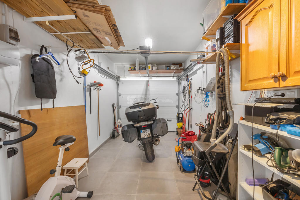 På bottenvåningen finns ett sovrum och ett badrum, ett rymligt vardagsrum med eldstad som skapar en varm och inbjudande atmosfär, samt matsal och ett funktionellt kök. Här finns även garage med direkt anslutning till huset.