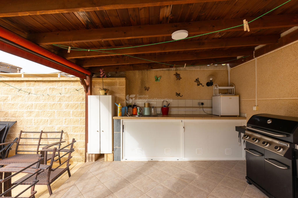 Invändigt präglas huset av ljus och rymd. Det öppna vardagsrummet och matsalen binds samman av en trivsam öppen spis som skapar en varm atmosfär. Köket ligger i direkt anslutning och är fullt utrustat, med utgång till den bakre delen av trädgården. Här finns även en separat gästavdelning med ett rymligt sovrum, eget badrum och praktiskt förvaringsutrymme – perfekt för familj och vänner som stannar lite längre.