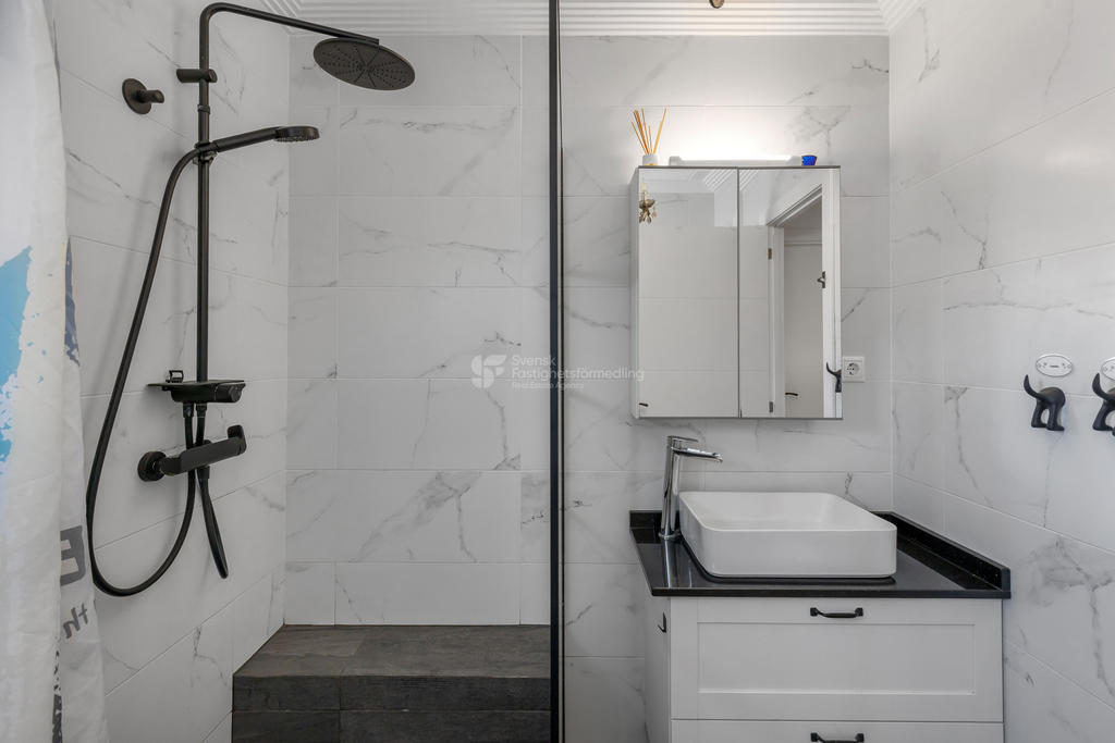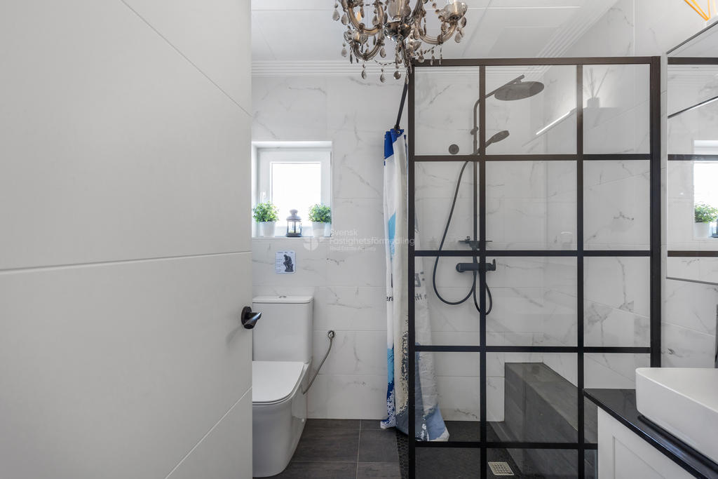 Bostaden erbjuder en ljus och öppen planlösning där vardagsrum och kök smälter samman på ett modernt och socialt sätt. Här finns två rymliga sovrum samt två fräscha badrum, perfekt för både permanentboende och semesterliv.