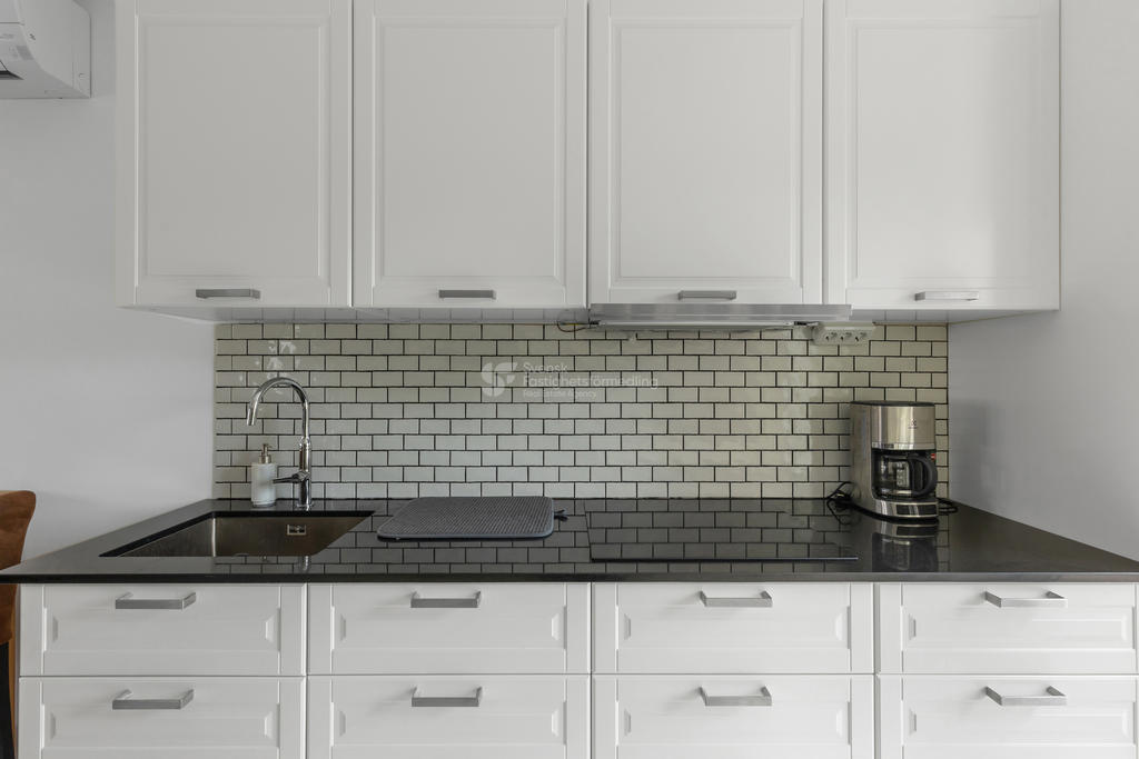 På entréplanet möts du av ett ljusfyllt vardagsrum i öppen planlösning mot köket, smakfullt inrett med nya, moderna möbler som dessutom ingår i köpet.