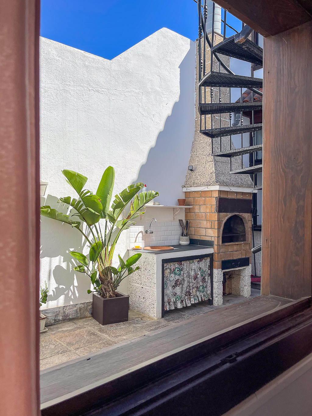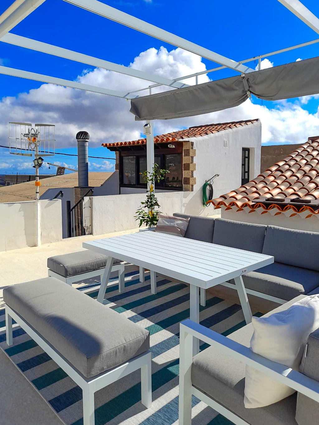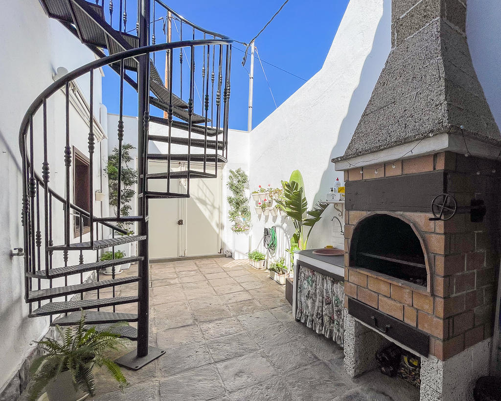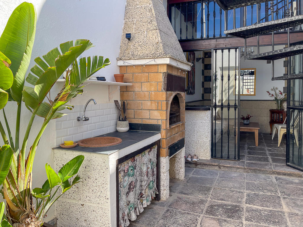 Utöver takterrassen bjuder huset på flera härliga uteplatser. Ett av rummen fungerar som ett extra vardagsrum, eller som i dagsläget, som en matsal – en charmig yta som är halvt inne, halvt ute, och fångar det bästa av båda världar. På innergården väntar dessutom en stor, murad grill och ett inbjudande utekök med plats för ett rejält matbord – här kan du samla familj och vänner för långa kvällar under den kanariska himlen.