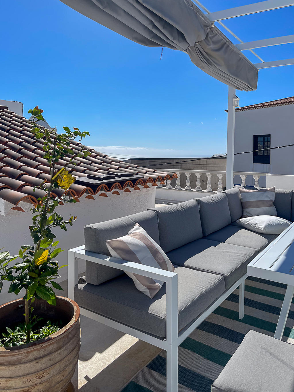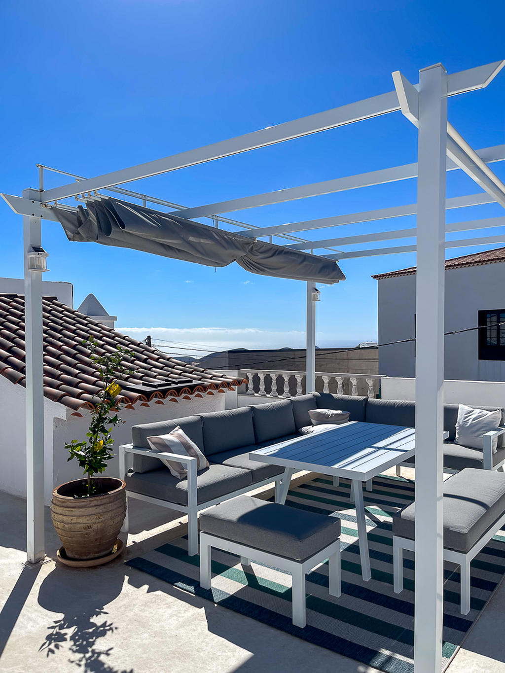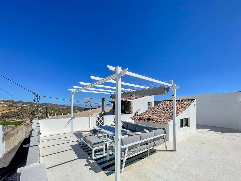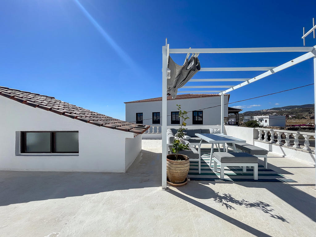 På den rymliga takterrassen finns en härlig chill out-yta med utsikt mot både Teide och havet. Här finns plats både för att sola, umgås med nära och kära. och varför inte njuta en utomhusbio under de varma sommarkvällarna? Detta är den perfekta platsen för långa kvällar med vänner och familj. Här uppe finns också ett tvättrum som kan användas som gym eller kontor, eller till och med inredas som ett gästrum.
