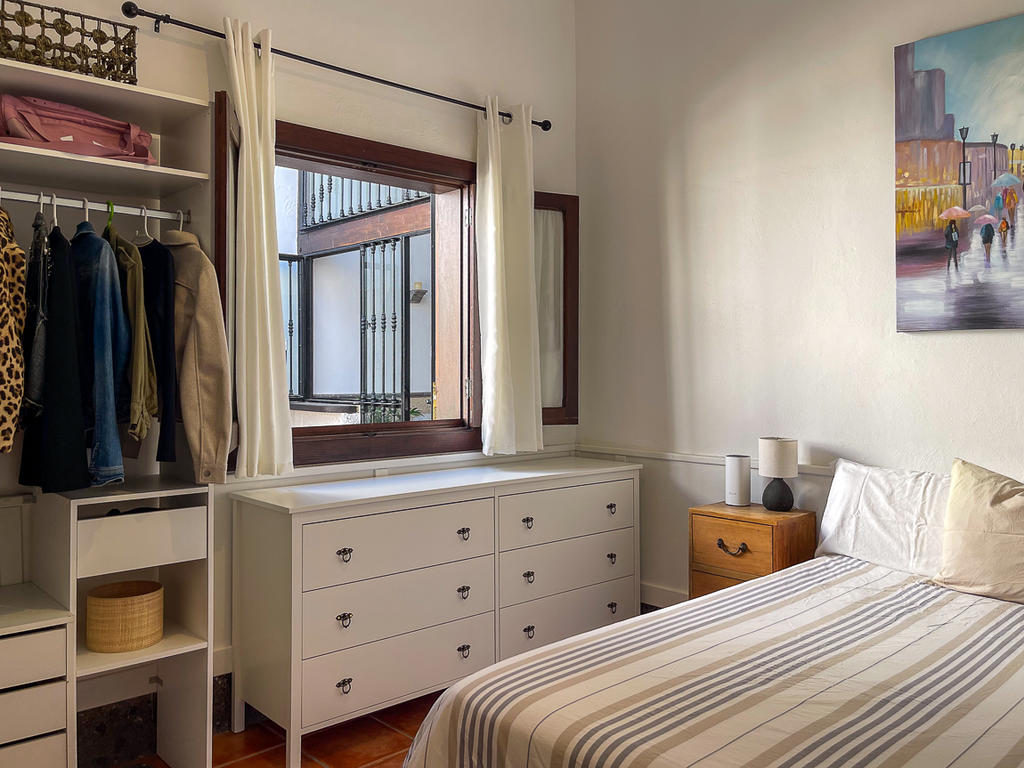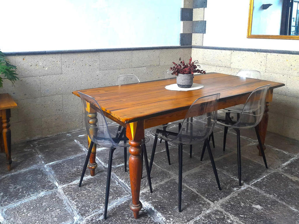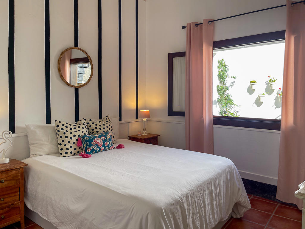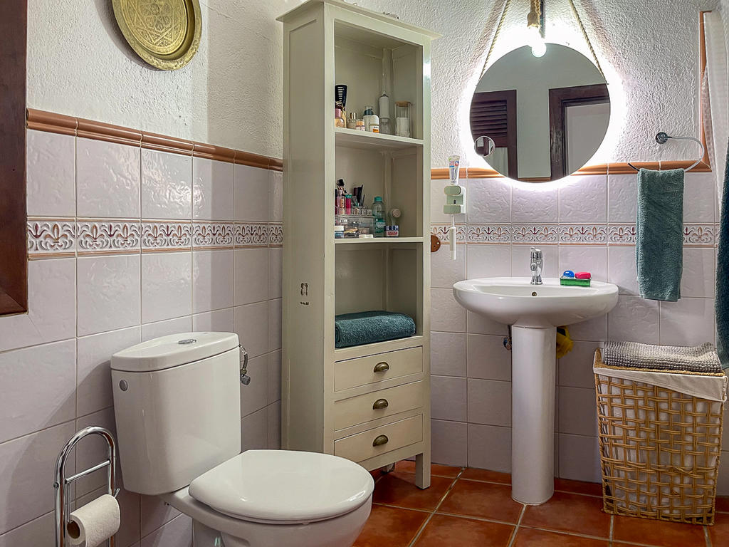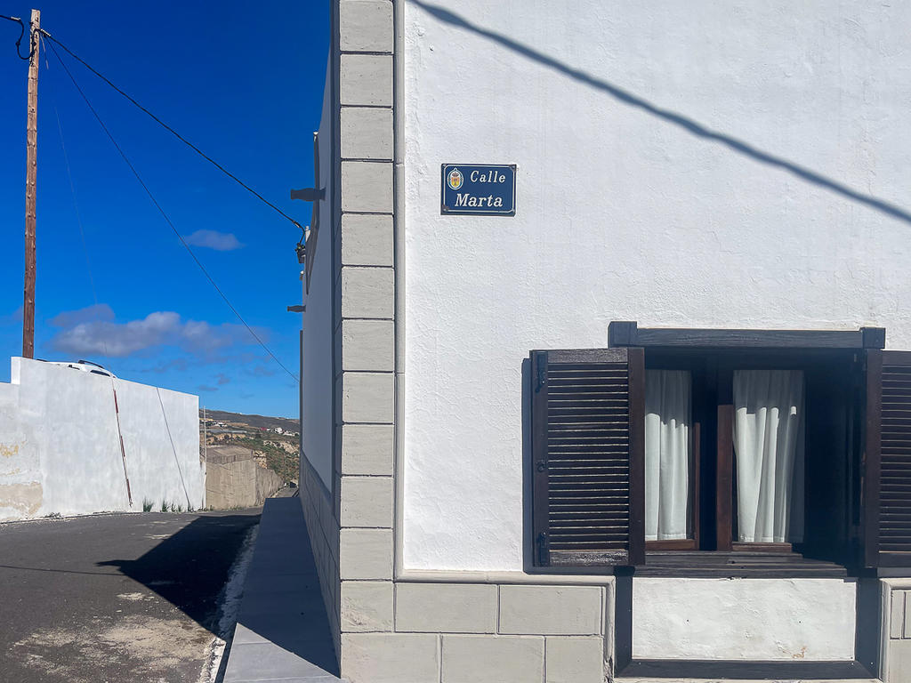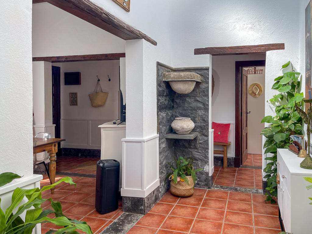 Huset är fristående och erbjuder gott om utrymme, högt i tak och vackra materialval: synliga träbalkar i taket, massiva dörrar, socklar i basaltsten och klassiska porslinsströmbrytare i gammaldags stil – allt samlat i en unik, kanarisk atmosfär. Här märks att varje del av huset är genomtänkt – både materialval och design har valts med känsla och respekt för husets själ.