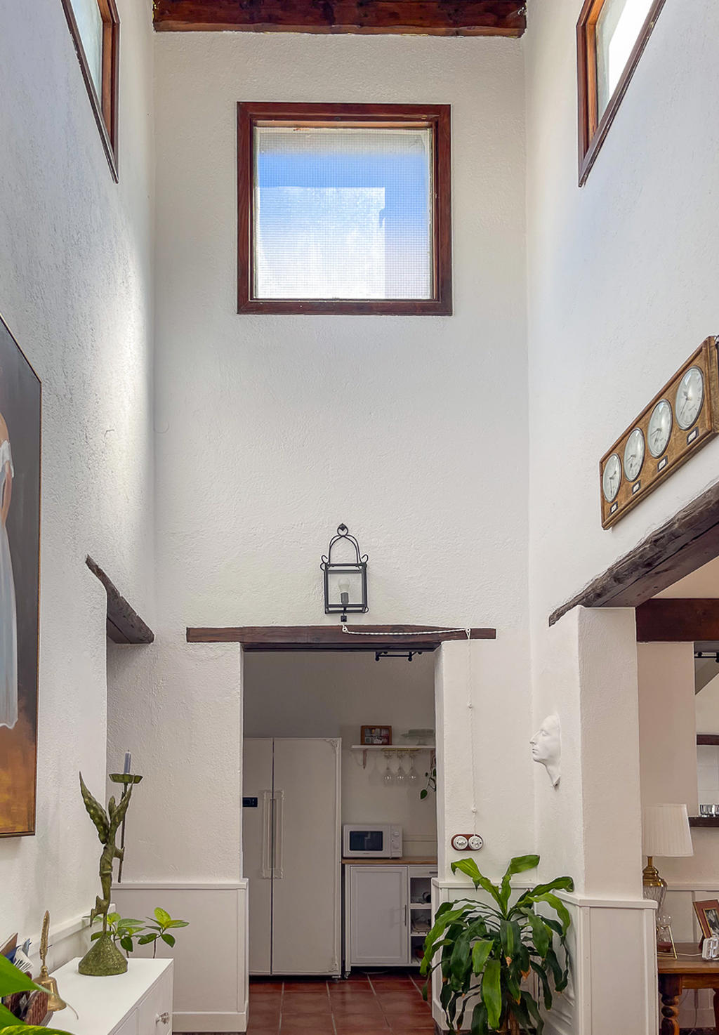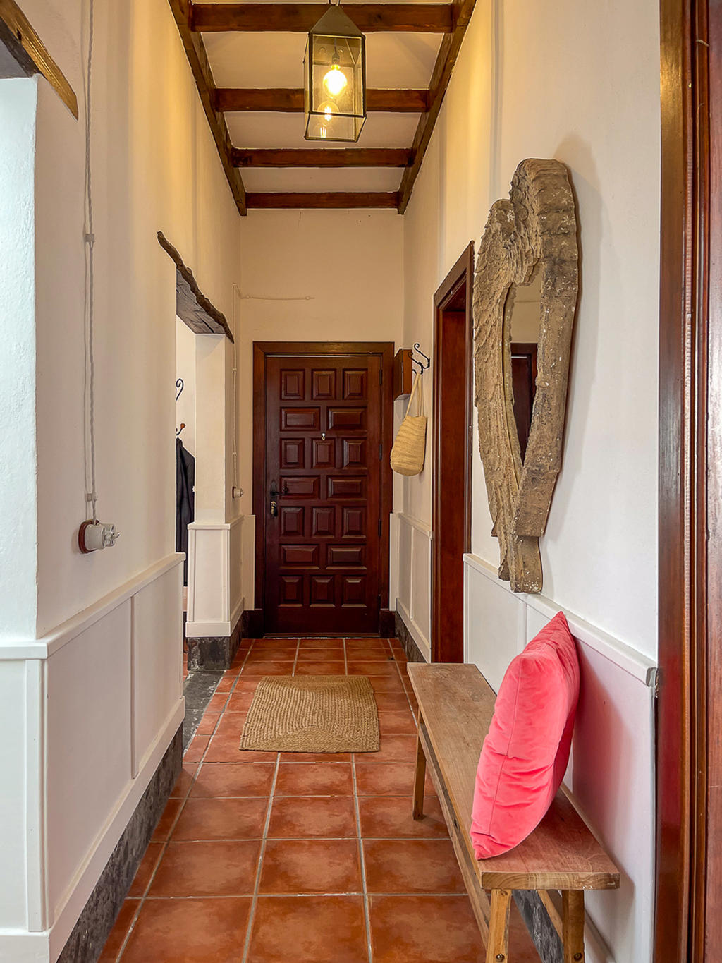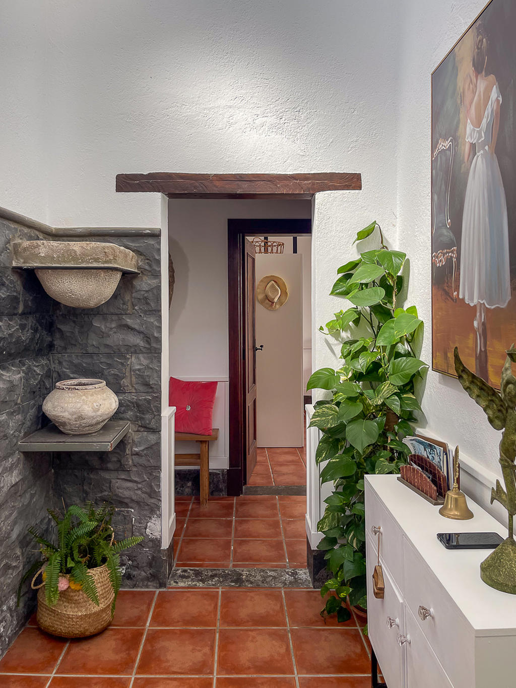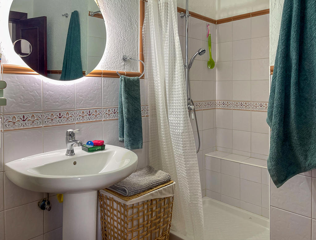 Huset är fristående och erbjuder gott om utrymme, högt i tak och vackra materialval: synliga träbalkar i taket, massiva dörrar, socklar i basaltsten och klassiska porslinsströmbrytare i gammaldags stil – allt samlat i en unik, kanarisk atmosfär. Här märks att varje del av huset är genomtänkt – både materialval och design har valts med känsla och respekt för husets själ.