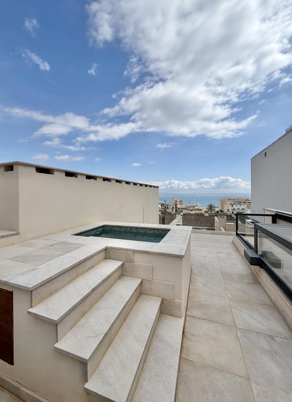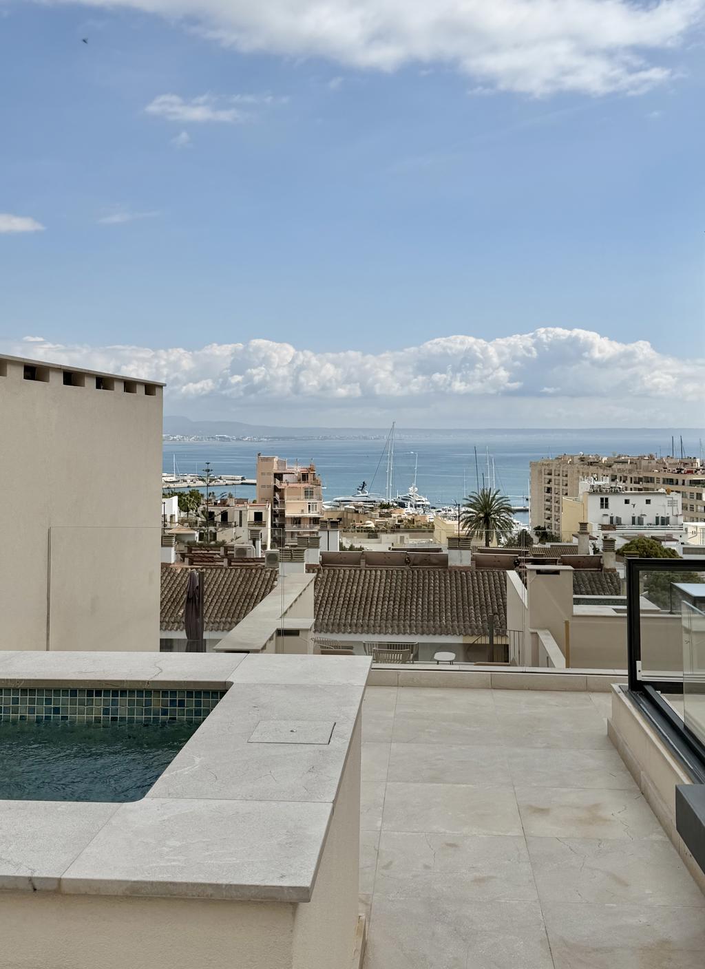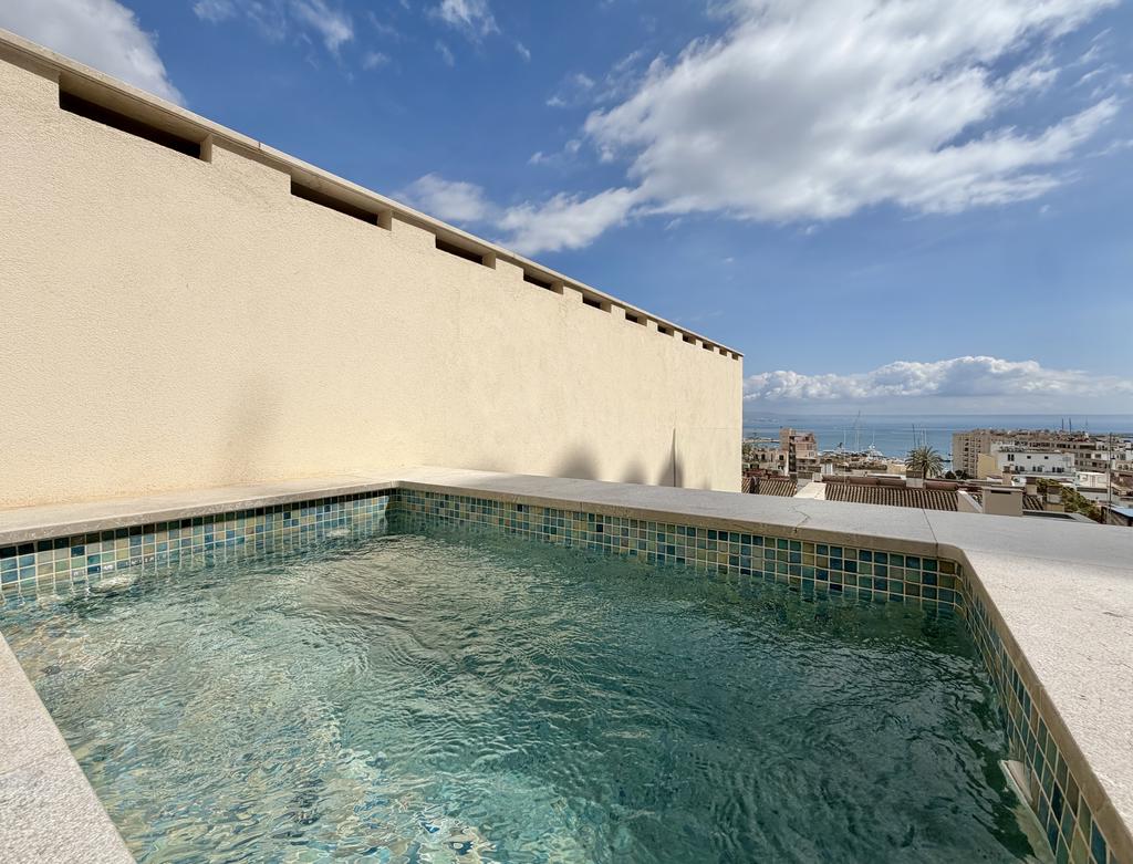 Högst upp finns en takterrass med plunge-pool där du kan njuta av en vidsträckt utsikt över Palma-bukten – en perfekt plats för både lugna morgnar och kvällar med vänner.