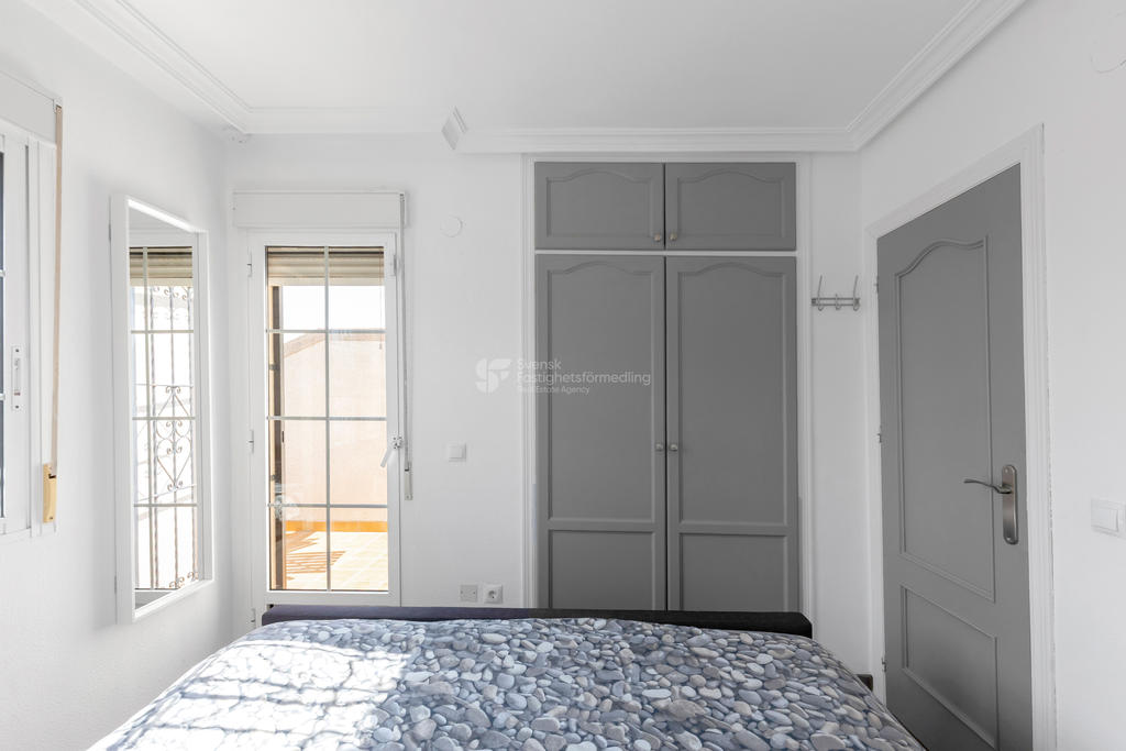 I anslutande till ett av sovrummen finns en balkong i sydöstläget, och på takterrassen har det tidigare förrådet förvandlats till ett mindre tredje sovrum eller kontor, vad som passar bäst.